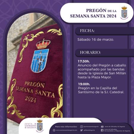 • Anuncio del Pregón a caballo, a partir de las 17:45 h., desde la Iglesia de San Millán hasta la Plaza Mayor, con la participación de todas las cofradías segovianas.